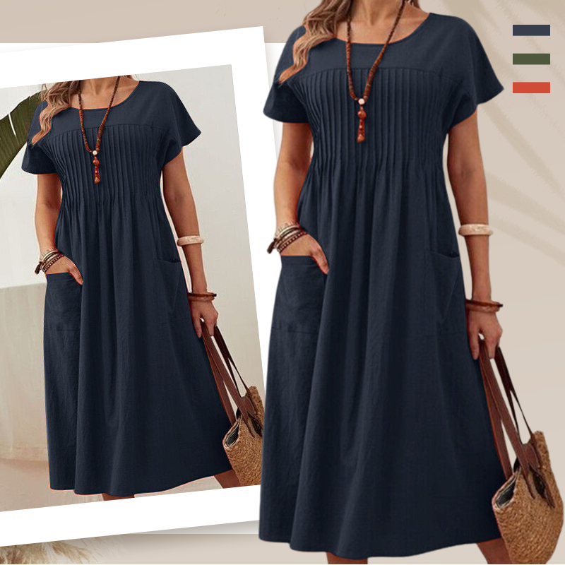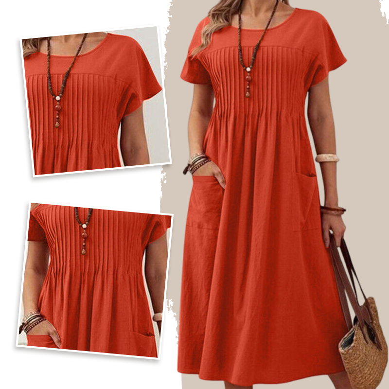 Sukienka plisowana damska z krótkimi rękawami i kieszeniami