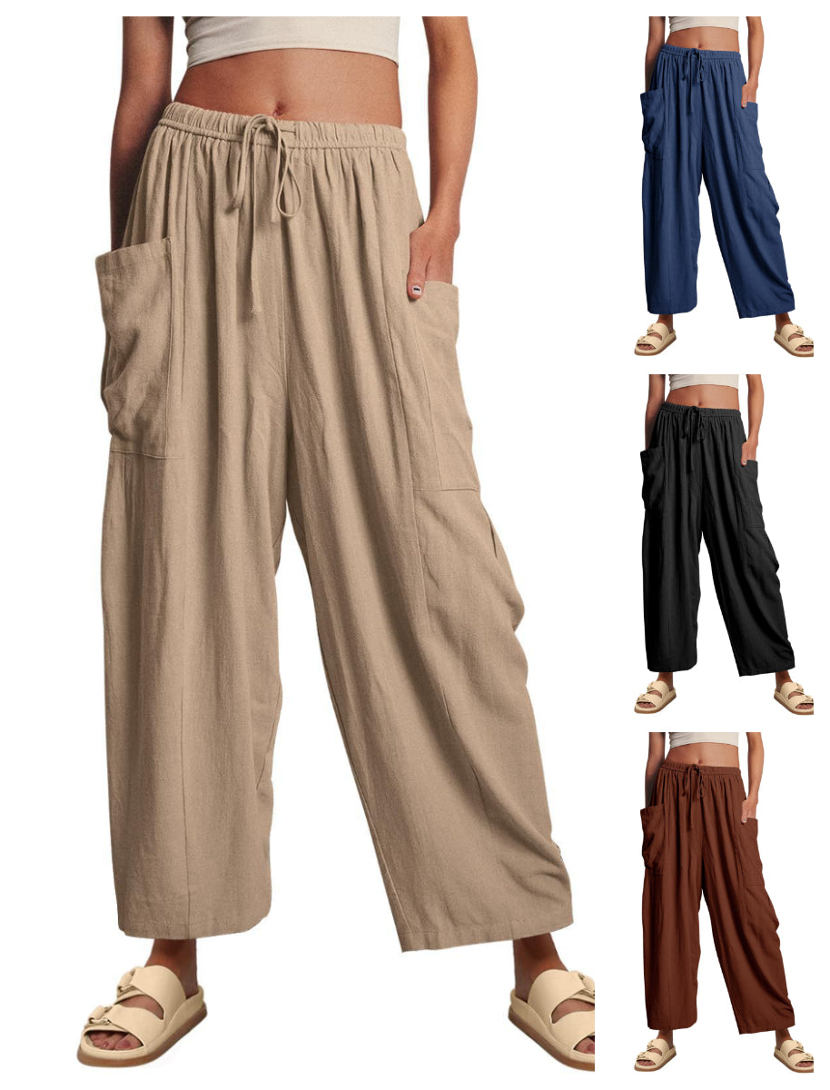 Najnowsze letnie spodnie o przewiewnym, haremowym kroju z wszytymi kieszeniami bocznymi.